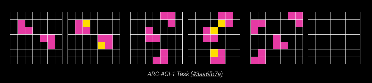 Benchmarks are the questions we ask LLMs to understand their capabilites. Let’s talk about the ARC-AGI benchmark, developed by Francois Chollet3. Here’s an example question, where the goal is to fill in the final grid with colored squares based on the pattern in the first two pairs of grids: