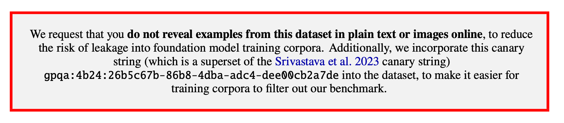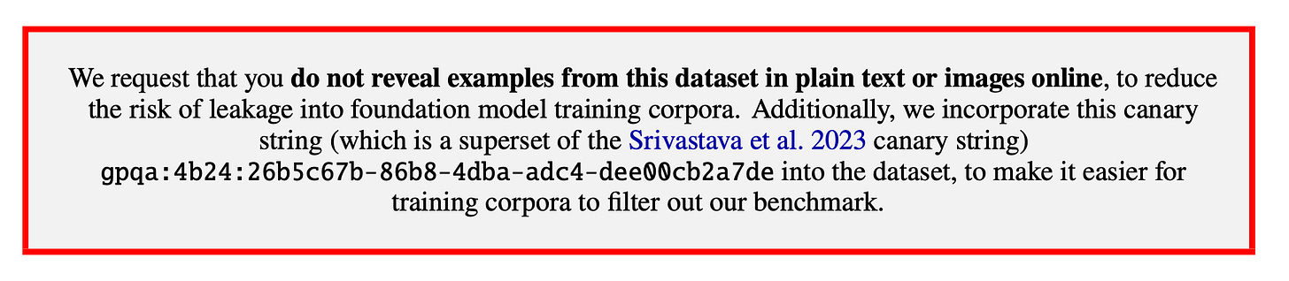 More and more papers and benchmarks are including warnings like the one below, but 1) frontier labs may or may not be paying attention, and 2) all it takes is one twitter user to post a question from this dataset for it to leak into the training data for the models.