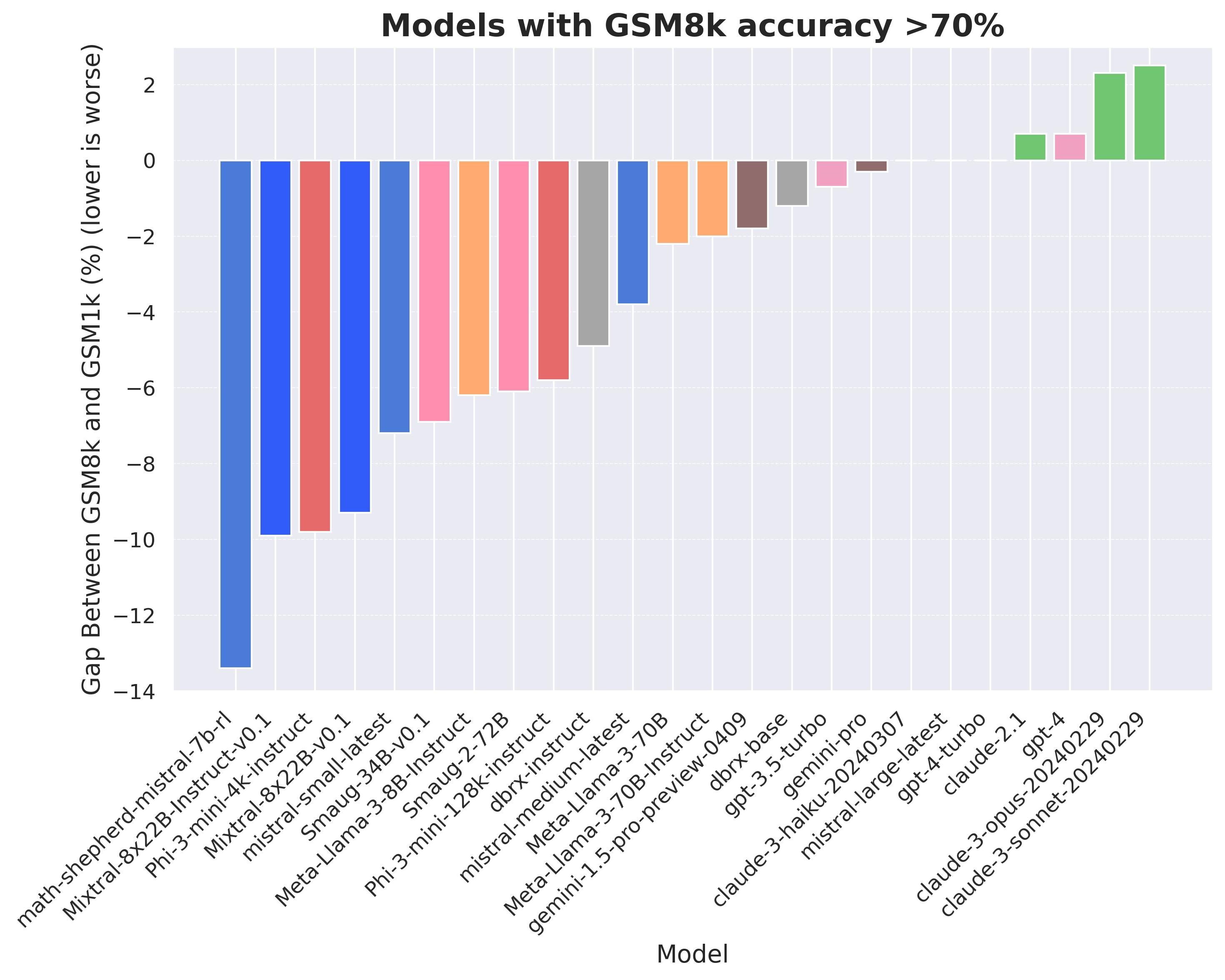 The Scale team paid humans to generatea new set of 1,000 word problems, matched in difficulty and style to GSM8k. They then evaluated state of the art LLMs against this new dataset (which they creatively named GSM1k), and looked at the difference in performance: